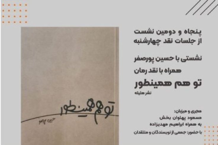به گزارش پایگاه خبری پهنه پرواز به نقل از ایسنا، سیروس نفیسی هماهنگ‌کننده جلسات «نقد چهارشنبه» با بیان اینکه پنجاه و دومین جلسه از این سلسله جلسات به نشست نقد و بررسی رمان «تو هم همینطور» اختصاص دارد، گفت: این نشست روز پنجشنبه (۲۶ مهر ماه) از ساعت ۱۵ در محل مجتمع فرهنگی کاف کتاب، با حضور نویسنده و جمعی از نویسندگان و منتقدان ادبی برگزار شد.