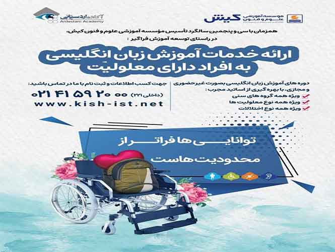 دوره های آموزش زبان انگلیسی بر اساس متد آموزشی موسسه علوم و فنون کیش و محتواهای آموزشی این موسسه، برای تمامی گروه های سنی با هر نوع معلولیتی برگزار خواهد شد. پس از ثبت نام علاقمندان و انجام ارزیابی اولیه و تعیین سطح ، دوره ها طبق ظرفیت ها و توانایی های داوطلبان ، بصورت تخصصی ارایه می گردد . متقاضیان می توانند جهت کسب اطلاعات بیشتر و ثبت نام ، به سایت موسسه علوم و فنون کیش www.kish-IST.net مراجعه نمایند و یا با شماره تلفن ۰۲۱۴۱۵۹۲۰۰۰ تماس بگیرند.
