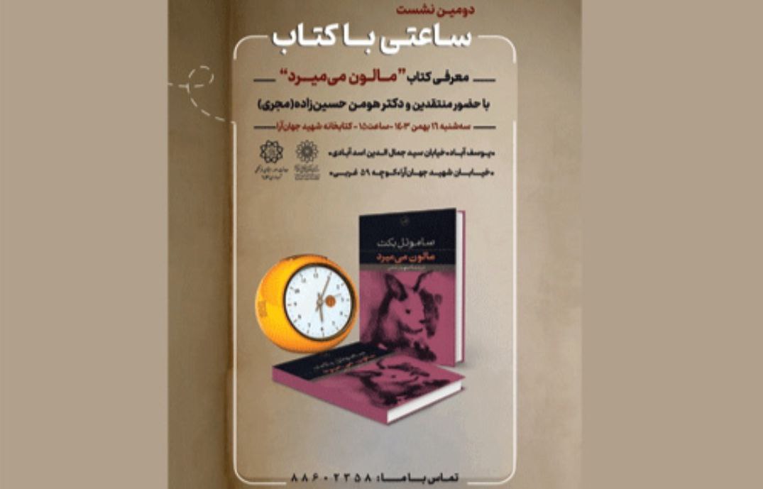 به گزارش پایگاه خبری پهنه پرواز به نقل از خبرگزاری کتاب ایران (ایبنا)، برگزاری دومین نشست «ساعتی با کتاب» اختصاص دارد به نقد و بررسی کتاب «مالون میمیرد» اثر ساموئل بکت و ترجمه سهیل سُمی، در روز سهشنبه ۱۶ بهمن ماه، ساعت ۱۵ در کتابخانه شهید سیدمحمدعلی جهان آرا برگزار میشود.